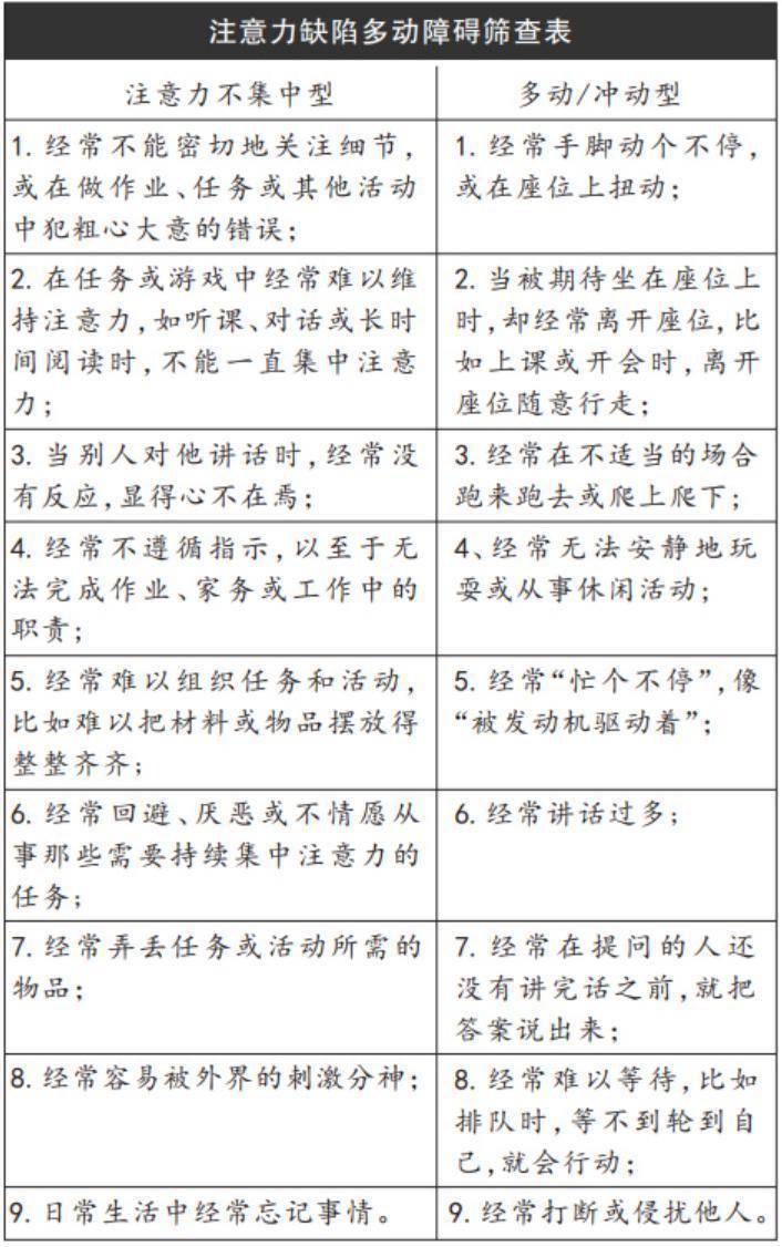 下表可帮助初筛多动症,可以对照测验。如果在两类指标中,有6条或6条以上症状时,就要警惕。